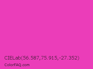 CIELab 56.587,75.915,-27.352 Color is a normal magenta color and the nearest color is Frostbite #e936a7. Hex code #eb3db9 and RGB value is rgb(235,61,185). In RGB color space, this color is composed of 92% red, 24% green, 73% blue, In CMYK color space, this color is composed of 0% cyan, 74% magenta, 21% yellow , 8% black , In HSL color space, this color has a hue angle of 317° , 81% saturation and 58% lightness.