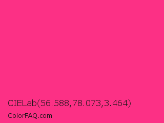 CIELab 56.588,78.073,3.464 Color is a normal rose color and the nearest color is Cerise Pink #ec3b83. Hex code #fc3085 and RGB value is rgb(252,48,133). In RGB color space, this color is composed of 99% red, 19% green, 52% blue, In CMYK color space, this color is composed of 0% cyan, 81% magenta, 47% yellow , 1% black , In HSL color space, this color has a hue angle of 335° , 97% saturation and 59% lightness.