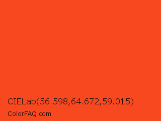 CIELab 56.598,64.672,59.015 Color is a normal red color and the nearest color is Pomegranate #f34723. Hex code #f74820 and RGB value is rgb(247,72,32). In RGB color space, this color is composed of 97% red, 28% green, 13% blue, In CMYK color space, this color is composed of 0% cyan, 71% magenta, 87% yellow , 3% black , In HSL color space, this color has a hue angle of 11° , 93% saturation and 55% lightness.