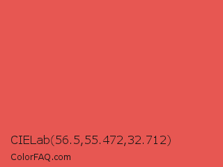 CIELab 56.5,55.472,32.712 Color is a light red color and the nearest color is Jelly Bean #da614e. Hex code #e75752 and RGB value is rgb(231,87,82). In RGB color space, this color is composed of 91% red, 34% green, 32% blue, In CMYK color space, this color is composed of 0% cyan, 62% magenta, 65% yellow , 9% black , In HSL color space, this color has a hue angle of 2° , 76% saturation and 61% lightness.