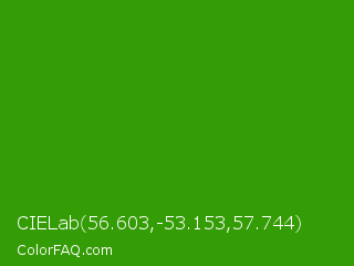 CIELab 56.603,-53.153,57.744 Color is a normal green color and the nearest color is Slimy Green #299617. Hex code #349c05 and RGB value is rgb(52,156,5). In RGB color space, this color is composed of 20% red, 61% green, 2% blue, In CMYK color space, this color is composed of 67% cyan, 0% magenta, 97% yellow , 39% black , In HSL color space, this color has a hue angle of 101° , 94% saturation and 32% lightness.