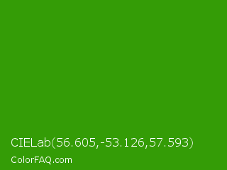 CIELab 56.605,-53.126,57.593 Color is a normal green color and the nearest color is Slimy Green #299617. Hex code #349c06 and RGB value is rgb(52,156,6). In RGB color space, this color is composed of 20% red, 61% green, 2% blue, In CMYK color space, this color is composed of 67% cyan, 0% magenta, 96% yellow , 39% black , In HSL color space, this color has a hue angle of 102° , 93% saturation and 32% lightness.