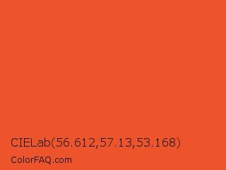 CIELab 56.612,57.13,53.168 Color is a normal red color and the nearest color is Flamingo #f2552a. Hex code #ed542c and RGB value is rgb(237,84,44). In RGB color space, this color is composed of 93% red, 33% green, 17% blue, In CMYK color space, this color is composed of 0% cyan, 65% magenta, 81% yellow , 7% black , In HSL color space, this color has a hue angle of 12° , 84% saturation and 55% lightness.
