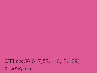 CIELab 56.647,57.116,-7.109 Color is a light rose color and the nearest color is Raspberry Pink #e25098. Hex code #dc5996 and RGB value is rgb(220,89,150). In RGB color space, this color is composed of 86% red, 35% green, 59% blue, In CMYK color space, this color is composed of 0% cyan, 60% magenta, 32% yellow , 14% black , In HSL color space, this color has a hue angle of 332° , 65% saturation and 61% lightness.