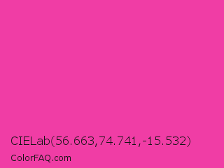CIELab 56.663,74.741,-15.532 Color is a normal magenta color and the nearest color is Frostbite #e936a7. Hex code #f03da5 and RGB value is rgb(240,61,165). In RGB color space, this color is composed of 94% red, 24% green, 65% blue, In CMYK color space, this color is composed of 0% cyan, 75% magenta, 31% yellow , 6% black , In HSL color space, this color has a hue angle of 325° , 86% saturation and 59% lightness.