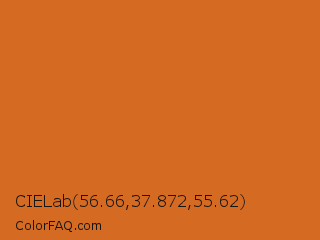 CIELab 56.66,37.872,55.62 Color is a normal orange color and the nearest color is Hot Cinnamon #d2691e. Hex code #d56a23 and RGB value is rgb(213,106,35). In RGB color space, this color is composed of 84% red, 42% green, 14% blue, In CMYK color space, this color is composed of 0% cyan, 50% magenta, 84% yellow , 16% black , In HSL color space, this color has a hue angle of 24° , 72% saturation and 49% lightness.