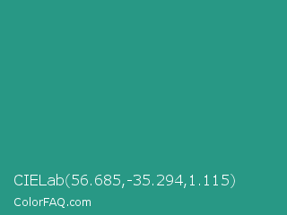 CIELab 56.685,-35.294,1.115 Color is a normal cyan color and the nearest color is Lochinvar #2c8c84. Hex code #289885 and RGB value is rgb(40,152,133). In RGB color space, this color is composed of 16% red, 60% green, 52% blue, In CMYK color space, this color is composed of 74% cyan, 0% magenta, 13% yellow , 40% black , In HSL color space, this color has a hue angle of 170° , 58% saturation and 38% lightness.