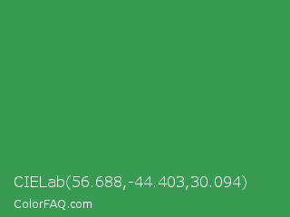 CIELab 56.688,-44.403,30.094 Color is a normal green color and the nearest color is Sea Green #2e8b57. Hex code #3a9a51 and RGB value is rgb(58,154,81). In RGB color space, this color is composed of 23% red, 60% green, 32% blue, In CMYK color space, this color is composed of 62% cyan, 0% magenta, 47% yellow , 40% black , In HSL color space, this color has a hue angle of 134° , 45% saturation and 42% lightness.