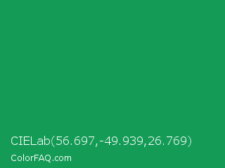 CIELab 56.697,-49.939,26.769 Color is a normal green color and the nearest color is Shamrock Green #009e60. Hex code #149c57 and RGB value is rgb(20,156,87). In RGB color space, this color is composed of 8% red, 61% green, 34% blue, In CMYK color space, this color is composed of 87% cyan, 0% magenta, 44% yellow , 39% black , In HSL color space, this color has a hue angle of 150° , 77% saturation and 35% lightness.