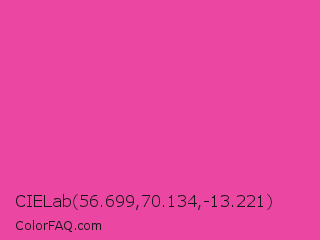 CIELab 56.699,70.134,-13.221 Color is a normal magenta color and the nearest color is Rose Bonbon #f9429e. Hex code #eb46a1 and RGB value is rgb(235,70,161). In RGB color space, this color is composed of 92% red, 27% green, 63% blue, In CMYK color space, this color is composed of 0% cyan, 70% magenta, 31% yellow , 8% black , In HSL color space, this color has a hue angle of 327° , 80% saturation and 60% lightness.