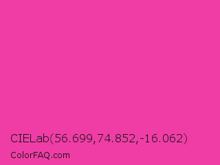 CIELab 56.699,74.852,-16.062 Color is a normal magenta color and the nearest color is Frostbite #e936a7. Hex code #f03da6 and RGB value is rgb(240,61,166). In RGB color space, this color is composed of 94% red, 24% green, 65% blue, In CMYK color space, this color is composed of 0% cyan, 75% magenta, 31% yellow , 6% black , In HSL color space, this color has a hue angle of 325° , 86% saturation and 59% lightness.