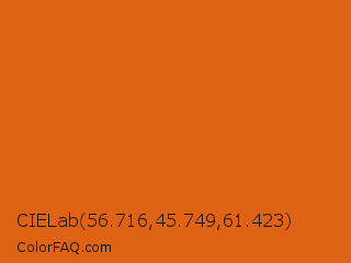 CIELab 56.716,45.749,61.423 Color is a normal orange color and the nearest color is Vivid Red Tangelo #df6124. Hex code #e06214 and RGB value is rgb(224,98,20). In RGB color space, this color is composed of 88% red, 38% green, 8% blue, In CMYK color space, this color is composed of 0% cyan, 56% magenta, 91% yellow , 12% black , In HSL color space, this color has a hue angle of 23° , 84% saturation and 48% lightness.