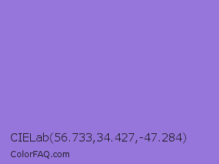 CIELab 56.733,34.427,-47.284 Color is a light indigo color and the nearest color is Medium Purple #9370db. Hex code #9776db and RGB value is rgb(151,118,219). In RGB color space, this color is composed of 59% red, 46% green, 86% blue, In CMYK color space, this color is composed of 31% cyan, 46% magenta, 0% yellow , 14% black , In HSL color space, this color has a hue angle of 260° , 58% saturation and 66% lightness.