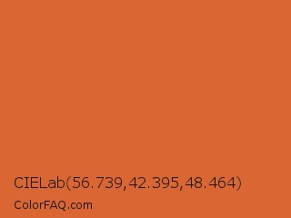 CIELab 56.739,42.395,48.464 Color is a normal orange color and the nearest color is Medium Vermilion #d9603b. Hex code #da6634 and RGB value is rgb(218,102,52). In RGB color space, this color is composed of 85% red, 40% green, 20% blue, In CMYK color space, this color is composed of 0% cyan, 53% magenta, 76% yellow , 15% black , In HSL color space, this color has a hue angle of 18° , 69% saturation and 53% lightness.