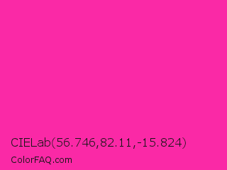 CIELab 56.746,82.11,-15.824 Color is a normal magenta color and the nearest color is Persian Rose #fe28a2. Hex code #fa29a6 and RGB value is rgb(250,41,166). In RGB color space, this color is composed of 98% red, 16% green, 65% blue, In CMYK color space, this color is composed of 0% cyan, 84% magenta, 34% yellow , 2% black , In HSL color space, this color has a hue angle of 324° , 95% saturation and 57% lightness.
