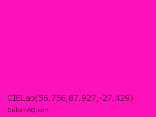 CIELab 56.756,87.927,-27.429 Color is a normal magenta color and the nearest color is Shocking Pink #fc0fc0. Hex code #fc12ba and RGB value is rgb(252,18,186). In RGB color space, this color is composed of 99% red, 7% green, 73% blue, In CMYK color space, this color is composed of 0% cyan, 93% magenta, 26% yellow , 1% black , In HSL color space, this color has a hue angle of 317° , 98% saturation and 53% lightness.