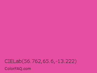 CIELab 56.762,65.6,-13.222 Color is a normal magenta color and the nearest color is Raspberry Pink #e25098. Hex code #e54ea1 and RGB value is rgb(229,78,161). In RGB color space, this color is composed of 90% red, 31% green, 63% blue, In CMYK color space, this color is composed of 0% cyan, 66% magenta, 30% yellow , 10% black , In HSL color space, this color has a hue angle of 327° , 74% saturation and 60% lightness.