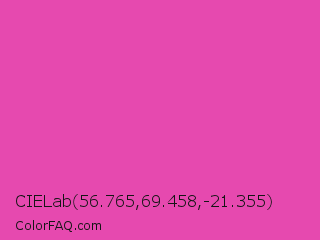 CIELab 56.765,69.458,-21.355 Color is a normal magenta color and the nearest color is Frostbite #e936a7. Hex code #e649af and RGB value is rgb(230,73,175). In RGB color space, this color is composed of 90% red, 29% green, 69% blue, In CMYK color space, this color is composed of 0% cyan, 68% magenta, 24% yellow , 10% black , In HSL color space, this color has a hue angle of 321° , 76% saturation and 59% lightness.
