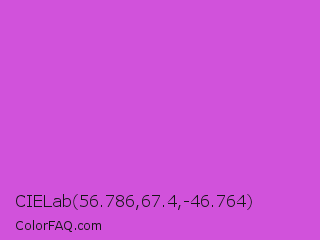CIELab 56.786,67.4,-46.764 Color is a normal magenta color and the nearest color is Medium Orchid #ba55d3. Hex code #d152db and RGB value is rgb(209,82,219). In RGB color space, this color is composed of 82% red, 32% green, 86% blue, In CMYK color space, this color is composed of 5% cyan, 63% magenta, 0% yellow , 14% black , In HSL color space, this color has a hue angle of 296° , 66% saturation and 59% lightness.