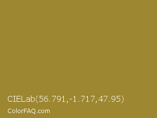 CIELab 56.791,-1.717,47.95 Color is a normal yellow color and the nearest color is Luxor Gold #a7882c. Hex code #9d8730 and RGB value is rgb(157,135,48). In RGB color space, this color is composed of 62% red, 53% green, 19% blue, In CMYK color space, this color is composed of 0% cyan, 14% magenta, 69% yellow , 38% black , In HSL color space, this color has a hue angle of 48° , 53% saturation and 40% lightness.