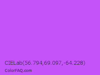 CIELab 56.794,69.097,-64.228 Color is a light purple color and the nearest color is Medium Orchid #ba55d3. Hex code #c254fa and RGB value is rgb(194,84,250). In RGB color space, this color is composed of 76% red, 33% green, 98% blue, In CMYK color space, this color is composed of 22% cyan, 66% magenta, 0% yellow , 2% black , In HSL color space, this color has a hue angle of 280° , 94% saturation and 65% lightness.