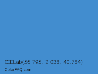 CIELab 56.795,-2.038,-40.784 Color is a normal blue color and the nearest color is Celestial Blue #4997d0. Hex code #428dcf and RGB value is rgb(66,141,207). In RGB color space, this color is composed of 26% red, 55% green, 81% blue, In CMYK color space, this color is composed of 68% cyan, 32% magenta, 0% yellow , 19% black , In HSL color space, this color has a hue angle of 208° , 59% saturation and 54% lightness.