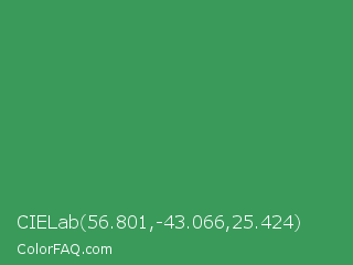 CIELab 56.801,-43.066,25.424 Color is a normal green color and the nearest color is Chateau Green #40a860. Hex code #399a5a and RGB value is rgb(57,154,90). In RGB color space, this color is composed of 22% red, 60% green, 35% blue, In CMYK color space, this color is composed of 63% cyan, 0% magenta, 42% yellow , 40% black , In HSL color space, this color has a hue angle of 140° , 46% saturation and 41% lightness.