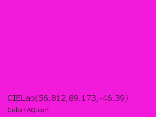 CIELab 56.812,89.173,-46.39 Color is a normal magenta color and the nearest color is Hot Magenta #ff1dce. Hex code #f21adb and RGB value is rgb(242,26,219). In RGB color space, this color is composed of 95% red, 10% green, 86% blue, In CMYK color space, this color is composed of 0% cyan, 89% magenta, 10% yellow , 5% black , In HSL color space, this color has a hue angle of 306° , 89% saturation and 53% lightness.