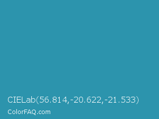 CIELab 56.814,-20.622,-21.533 Color is a normal cyan color and the nearest color is Eastern Blue #1e9ab0. Hex code #2c94ad and RGB value is rgb(44,148,173). In RGB color space, this color is composed of 17% red, 58% green, 68% blue, In CMYK color space, this color is composed of 75% cyan, 14% magenta, 0% yellow , 32% black , In HSL color space, this color has a hue angle of 192° , 59% saturation and 43% lightness.