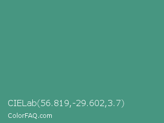 CIELab 56.819,-29.602,3.7 Color is a normal cyan color and the nearest color is Wintergreen Dream #56887d. Hex code #479681 and RGB value is rgb(71,150,129). In RGB color space, this color is composed of 28% red, 59% green, 51% blue, In CMYK color space, this color is composed of 53% cyan, 0% magenta, 14% yellow , 41% black , In HSL color space, this color has a hue angle of 164° , 36% saturation and 43% lightness.