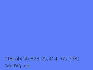 CIELab 56.823,25.414,-65.758 Color is a light blue color and the nearest color is Blueberry #4f86f7. Hex code #5c80fc and RGB value is rgb(92,128,252). In RGB color space, this color is composed of 36% red, 50% green, 99% blue, In CMYK color space, this color is composed of 63% cyan, 49% magenta, 0% yellow , 1% black , In HSL color space, this color has a hue angle of 227° , 96% saturation and 67% lightness.
