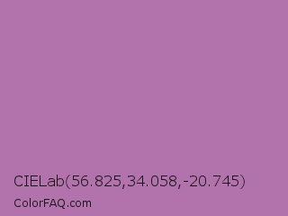 CIELab 56.825,34.058,-20.745 Color is a normal magenta color and the nearest color is Pearly Purple #b768a2. Hex code #b273ad and RGB value is rgb(178,115,173). In RGB color space, this color is composed of 70% red, 45% green, 68% blue, In CMYK color space, this color is composed of 0% cyan, 35% magenta, 3% yellow , 30% black , In HSL color space, this color has a hue angle of 305° , 29% saturation and 57% lightness.