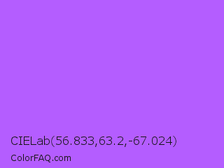 CIELab 56.833,63.2,-67.024 Color is a light purple color and the nearest color is Navy Purple #9457eb. Hex code #b45dff and RGB value is rgb(180,93,255). In RGB color space, this color is composed of 71% red, 36% green, 100% blue, In CMYK color space, this color is composed of 29% cyan, 64% magenta, 0% yellow , 0% black , In HSL color space, this color has a hue angle of 272° , 100% saturation and 68% lightness.