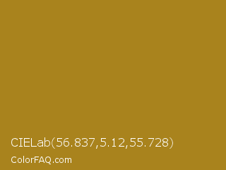 CIELab 56.837,5.12,55.728 Color is a normal orange color and the nearest color is Reef Gold #9f821c. Hex code #a9831d and RGB value is rgb(169,131,29). In RGB color space, this color is composed of 66% red, 51% green, 11% blue, In CMYK color space, this color is composed of 0% cyan, 22% magenta, 83% yellow , 34% black , In HSL color space, this color has a hue angle of 44° , 71% saturation and 39% lightness.