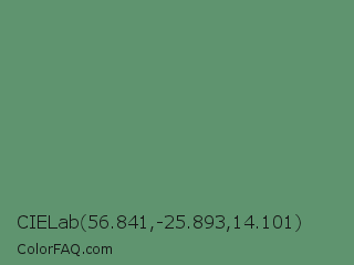 CIELab 56.841,-25.893,14.101 Color is a normal green color and the nearest color is Russian Green #679267. Hex code #5f946f and RGB value is rgb(95,148,111). In RGB color space, this color is composed of 37% red, 58% green, 44% blue, In CMYK color space, this color is composed of 36% cyan, 0% magenta, 25% yellow , 42% black , In HSL color space, this color has a hue angle of 138° , 22% saturation and 48% lightness.