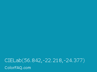 CIELab 56.842,-22.218,-24.377 Color is a normal cyan color and the nearest color is Blue Munsell #0093af. Hex code #0895b2 and RGB value is rgb(8,149,178). In RGB color space, this color is composed of 3% red, 58% green, 70% blue, In CMYK color space, this color is composed of 96% cyan, 16% magenta, 0% yellow , 30% black , In HSL color space, this color has a hue angle of 190° , 91% saturation and 36% lightness.