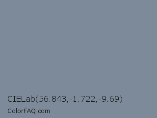 CIELab 56.843,-1.722,-9.69 Color is a normal blue color and the nearest color is Light Slate Gray #778899. Hex code #7c8a99 and RGB value is rgb(124,138,153). In RGB color space, this color is composed of 49% red, 54% green, 60% blue, In CMYK color space, this color is composed of 19% cyan, 10% magenta, 0% yellow , 40% black , In HSL color space, this color has a hue angle of 211° , 12% saturation and 54% lightness.