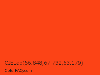 CIELab 56.848,67.732,63.179 Color is a normal red color and the nearest color is Orioles Orange #fb4f14. Hex code #fc4316 and RGB value is rgb(252,67,22). In RGB color space, this color is composed of 99% red, 26% green, 9% blue, In CMYK color space, this color is composed of 0% cyan, 73% magenta, 91% yellow , 1% black , In HSL color space, this color has a hue angle of 12° , 97% saturation and 54% lightness.