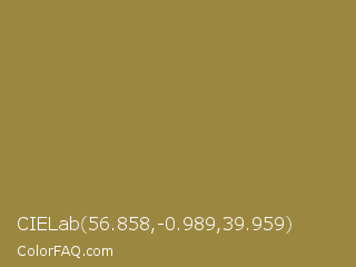 CIELab 56.858,-0.989,39.959 Color is a normal yellow color and the nearest color is Metallic Sunburst #9c7c38. Hex code #9c8741 and RGB value is rgb(156,135,65). In RGB color space, this color is composed of 61% red, 53% green, 25% blue, In CMYK color space, this color is composed of 0% cyan, 13% magenta, 58% yellow , 39% black , In HSL color space, this color has a hue angle of 46° , 41% saturation and 43% lightness.