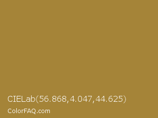 CIELab 56.868,4.047,44.625 Color is a normal orange color and the nearest color is Metallic Sunburst #9c7c38. Hex code #a58438 and RGB value is rgb(165,132,56). In RGB color space, this color is composed of 65% red, 52% green, 22% blue, In CMYK color space, this color is composed of 0% cyan, 20% magenta, 66% yellow , 35% black , In HSL color space, this color has a hue angle of 42° , 49% saturation and 43% lightness.
