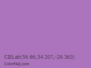 CIELab 56.86,34.207,-29.363 Color is a normal purple color and the nearest color is African Violet #b284be. Hex code #ab74bc and RGB value is rgb(171,116,188). In RGB color space, this color is composed of 67% red, 45% green, 74% blue, In CMYK color space, this color is composed of 9% cyan, 38% magenta, 0% yellow , 26% black , In HSL color space, this color has a hue angle of 286° , 35% saturation and 60% lightness.