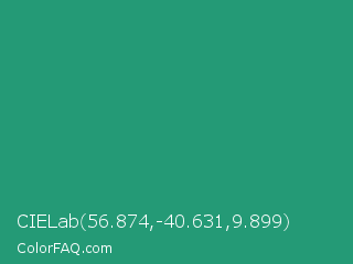 CIELab 56.874,-40.631,9.899 Color is a normal green color and the nearest color is Illuminating Emerald #319177. Hex code #249a76 and RGB value is rgb(36,154,118). In RGB color space, this color is composed of 14% red, 60% green, 46% blue, In CMYK color space, this color is composed of 77% cyan, 0% magenta, 23% yellow , 40% black , In HSL color space, this color has a hue angle of 162° , 62% saturation and 37% lightness.