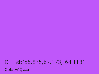 CIELab 56.875,67.173,-64.118 Color is a light purple color and the nearest color is Medium Orchid #ba55d3. Hex code #bf57fa and RGB value is rgb(191,87,250). In RGB color space, this color is composed of 75% red, 34% green, 98% blue, In CMYK color space, this color is composed of 24% cyan, 65% magenta, 0% yellow , 2% black , In HSL color space, this color has a hue angle of 278° , 94% saturation and 66% lightness.