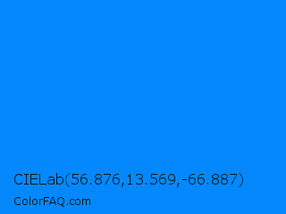 CIELab 56.876,13.569,-66.887 Color is a normal blue color and the nearest color is Azure Radiance #007fff. Hex code #0588fe and RGB value is rgb(5,136,254). In RGB color space, this color is composed of 2% red, 53% green, 100% blue, In CMYK color space, this color is composed of 98% cyan, 46% magenta, 0% yellow , 0% black , In HSL color space, this color has a hue angle of 208° , 99% saturation and 51% lightness.