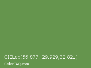 CIELab 56.877,-29.929,32.821 Color is a normal green color and the nearest color is Palm Leaf #6f9940. Hex code #65954d and RGB value is rgb(101,149,77). In RGB color space, this color is composed of 40% red, 58% green, 30% blue, In CMYK color space, this color is composed of 32% cyan, 0% magenta, 48% yellow , 42% black , In HSL color space, this color has a hue angle of 100° , 32% saturation and 44% lightness.