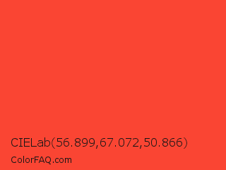 CIELab 56.899,67.072,50.866 Color is a normal red color and the nearest color is Red Orange #ff3f34. Hex code #fa4533 and RGB value is rgb(250,69,51). In RGB color space, this color is composed of 98% red, 27% green, 20% blue, In CMYK color space, this color is composed of 0% cyan, 72% magenta, 80% yellow , 2% black , In HSL color space, this color has a hue angle of 5° , 95% saturation and 59% lightness.