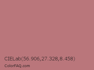 CIELab 56.906,27.328,8.458 Color is a normal red color and the nearest color is Rose Gold #b76e79. Hex code #ba767b and RGB value is rgb(186,118,123). In RGB color space, this color is composed of 73% red, 46% green, 48% blue, In CMYK color space, this color is composed of 0% cyan, 37% magenta, 34% yellow , 27% black , In HSL color space, this color has a hue angle of 356° , 33% saturation and 60% lightness.