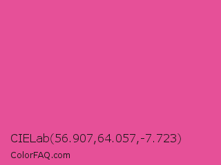 CIELab 56.907,64.057,-7.723 Color is a light rose color and the nearest color is Raspberry Pink #e25098. Hex code #e65098 and RGB value is rgb(230,80,152). In RGB color space, this color is composed of 90% red, 31% green, 60% blue, In CMYK color space, this color is composed of 0% cyan, 65% magenta, 34% yellow , 10% black , In HSL color space, this color has a hue angle of 331° , 75% saturation and 61% lightness.