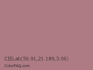 CIELab 56.91,21.189,3.06 Color is a normal red color and the nearest color is Turkish Rose #b57281. Hex code #ae7b84 and RGB value is rgb(174,123,132). In RGB color space, this color is composed of 68% red, 48% green, 52% blue, In CMYK color space, this color is composed of 0% cyan, 29% magenta, 24% yellow , 32% black , In HSL color space, this color has a hue angle of 349° , 24% saturation and 58% lightness.