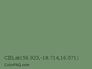 CIELab 56.923,-18.714,16.071 Color is a normal green color and the nearest color is Highland #6f8e63. Hex code #71916c and RGB value is rgb(113,145,108). In RGB color space, this color is composed of 44% red, 57% green, 42% blue, In CMYK color space, this color is composed of 22% cyan, 0% magenta, 26% yellow , 43% black , In HSL color space, this color has a hue angle of 112° , 15% saturation and 50% lightness.